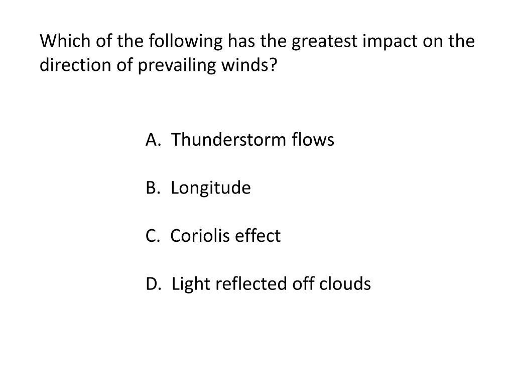 Which of the following has the greatest impact on the direction of prevailing winds? A. Thunderstorm flows B. Longitude C. Coriolis effect D. Light reflected off clouds