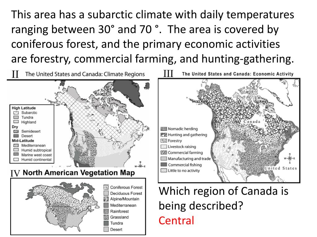 United States and Canada. Unit Four. What assumption can be made about economic activity and c limate in North America?. Less forestry occurs in mid-latitude climates. Which geographic factor most likely had the greatest influence on the pattern of settlements in eastern Canada?.