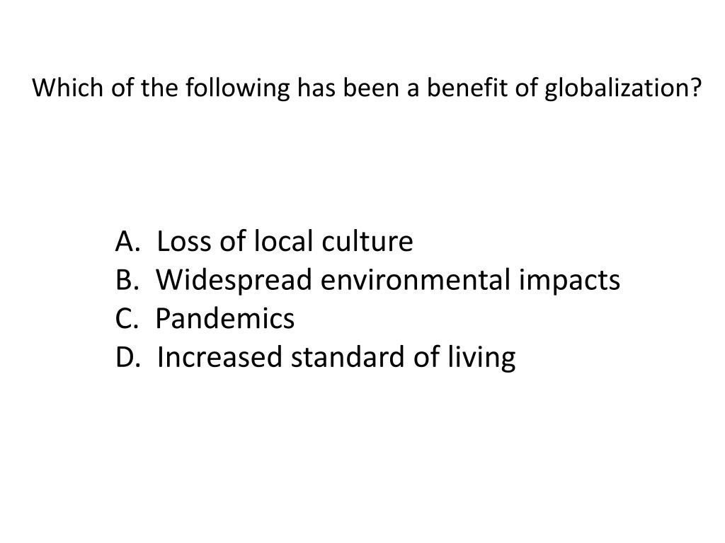 Which of the following has been a benefit of globalization? A. Loss of local culture B. Widespread environmental impacts C. Pandemics D. Increased standard of living