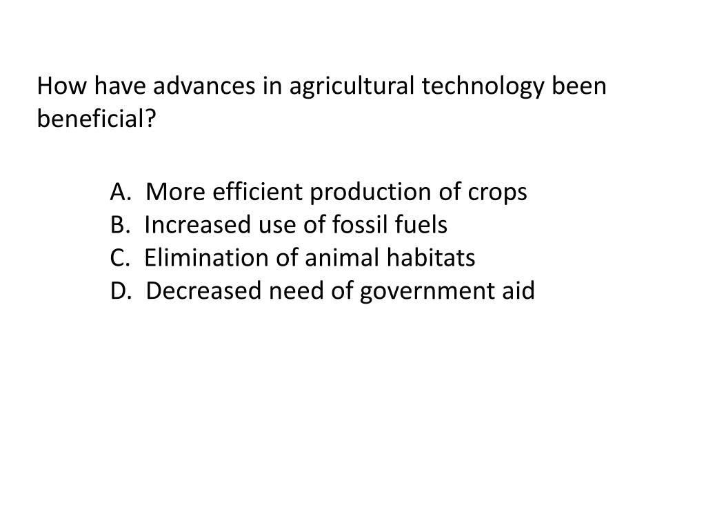 How have advances in agricultural technology been beneficial? A. More efficient production of crops B. Increased use of fossil fuels C. Elimination of animal habitats D. Decreased need of government aid