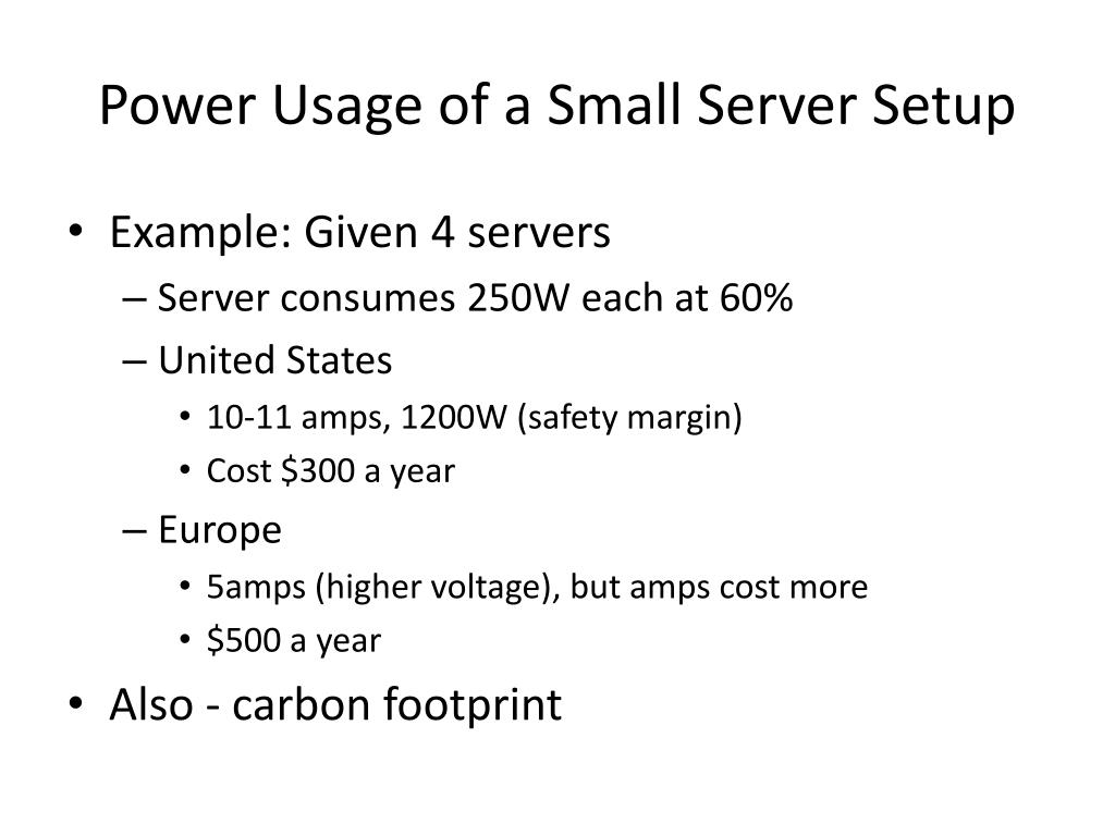 Power Usage of a Small Server Setup • Example: Given 4 servers • Server consumes 250W each at 60% • United States • 10-11 amps, 1200W (safety margin) • Cost $300 a year • Europe • 5amps (higher voltage), but amps cost more • $500 a year • Also - carbon footprint