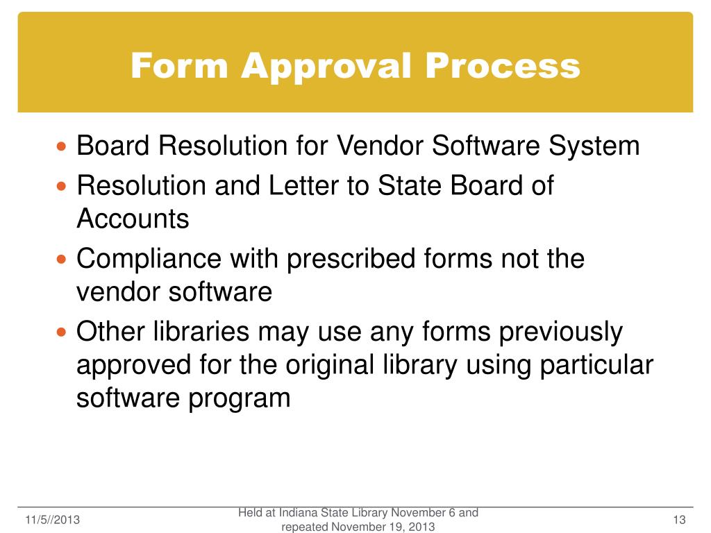 Form Approval Process • Board Resolution for Vendor Software System • Resolution and Letter to State Board of Accounts • Compliance with prescribed forms not the vendor software • Other libraries may use any forms previously approved for the original library using particular software program Held at Indiana State Library November 6 and repeated November 19, 2013