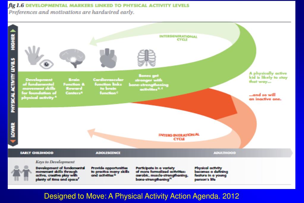 Physical Activity Levels 2012 Grade F Physical Activity Levels Only 7% of children and youth are meeting Canada’s guidelines of 60 minutes of physical activity a day 46% of Canadian children and youth are getting a mere 3 hours or less of active play each week (including weekend days) Kids are spending 63% of their free time after school and on weekends being sedentary 92% of Canadian kids said, if given the choice, they would choose to play with friends over watching TV The proportion of Canadian kids who play outside after school dropped 14% over the last decade At lunch and after school, kids are getting only 24 minutes of moderate- to vigorous- intensity physical activity out of a possible 4 hours.