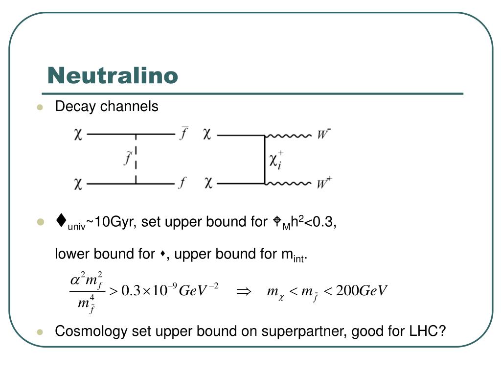 Neutralino • Decay channels • univ~10Gyr, set upper bound for Mh2<0.3,lower bound for , upper bound for mint. • Cosmology set upper bound on superpartner, good for LHC?