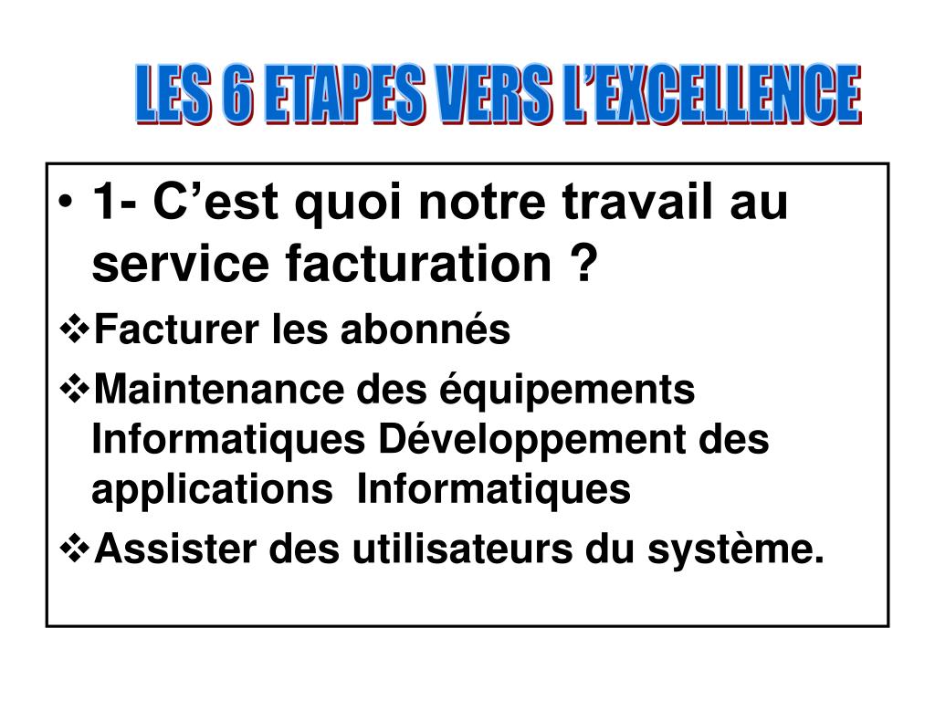 LES 6 ETAPES VERS L’EXCELLENCE • 1- C’est quoi notre travail au service facturation ? • Facturer les abonnés • Maintenance des équipements Informatiques Développement des applications Informatiques • Assister des utilisateurs du système.