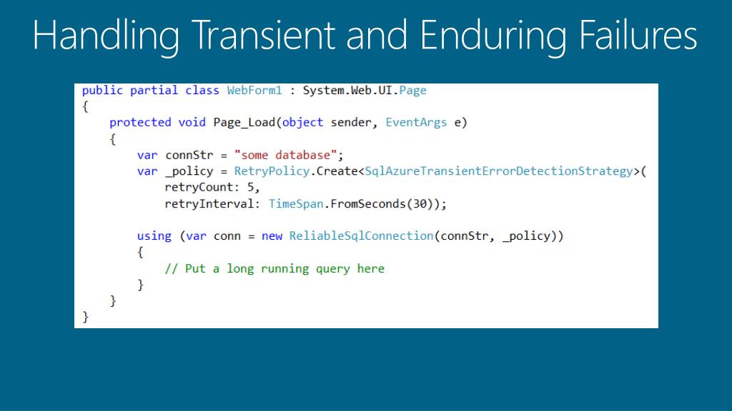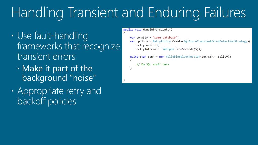 Handling Transient and Enduring Failures • Use fault-handling frameworks that recognize transient errors • Make it part of the background ”noise” • Appropriate retry and backoff policies