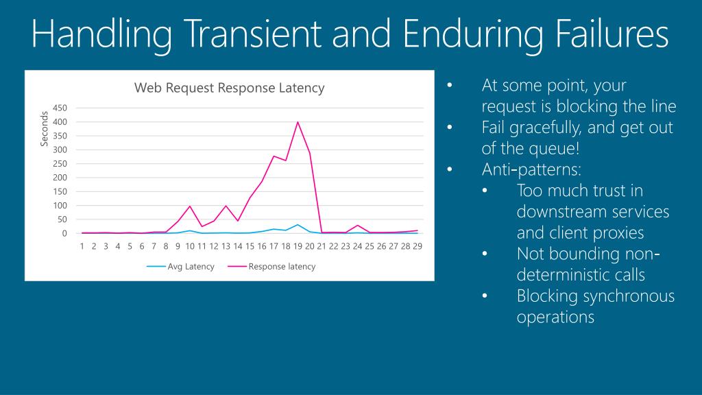 Handling Transient and Enduring Failures • At some point, your request is blocking the line • Fail gracefully, and get out of the queue! • Anti-patterns: • Too much trust in downstream services and client proxies • Not bounding non-deterministic calls • Blocking synchronous operations