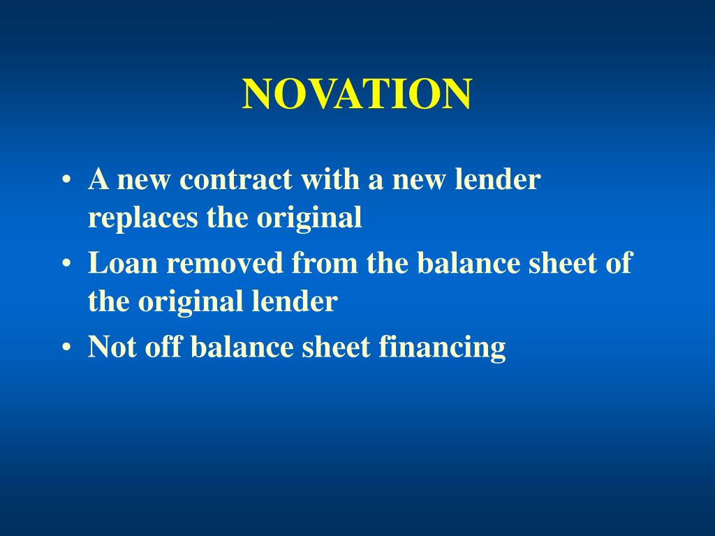 NOVATION • A new contract with a new lender replaces the original • Loan removed from the balance sheet of the original lender • Not off balance sheet financing