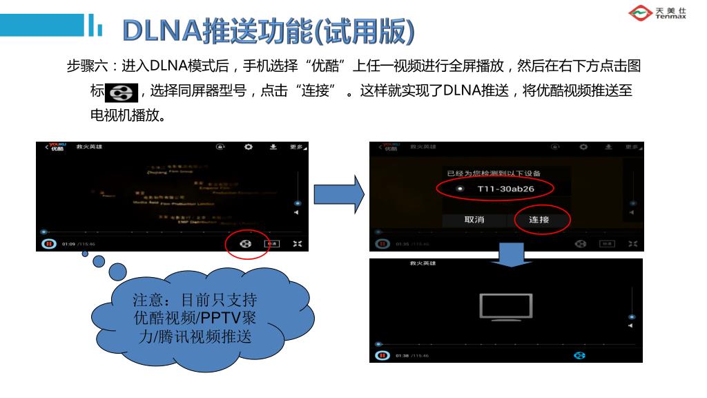 DLNA推送功能(试用版) 步骤六:进入DLNA模式后,手机选择“优酷”上任一视频进行全屏播放,然后在右下方点击图标 ,选择同屏器型号,点击“连接” 。这样就实现了DLNA推送,将优酷视频推送至电视机播放。 注意:目前只支持优酷视频/PPTV聚力/腾讯视频推送