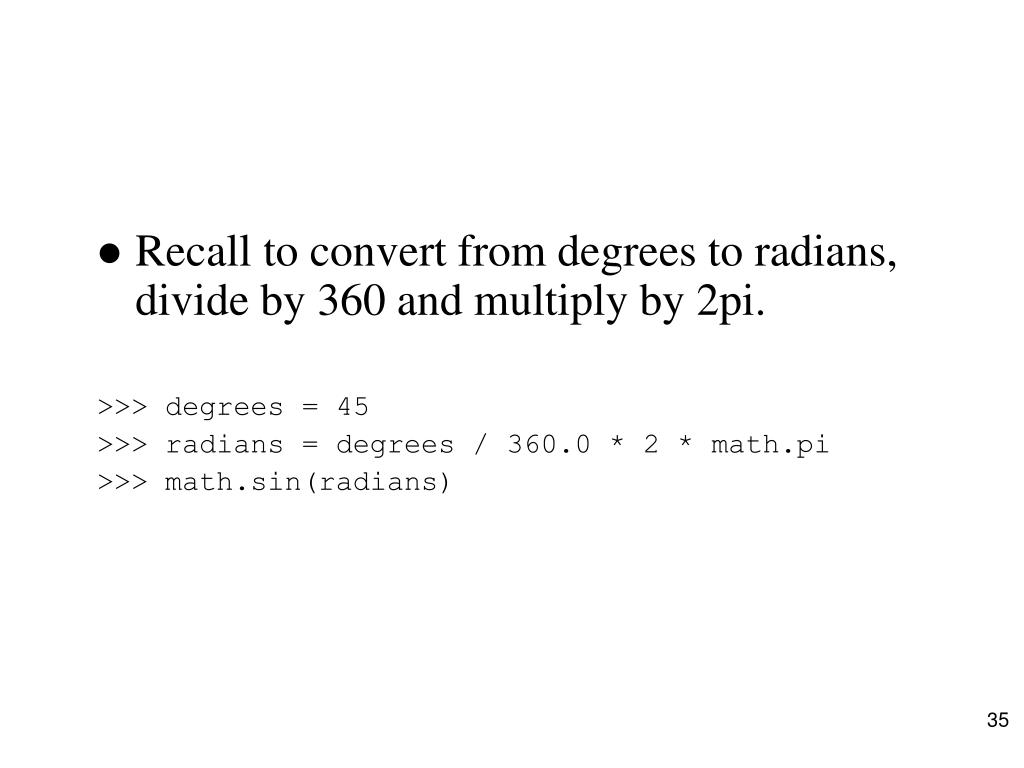 Recall to convert from degrees to radians, divide by 360 and multiply by 2pi. >>> degrees = 45 >>> radians = degrees / 360.0 * 2 * math.pi >>> math.sin(radians)