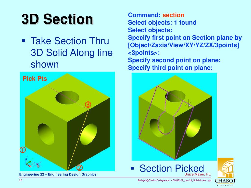 Take Section Thru 3D Solid Along line shown 3D Section Command: section Select objects: 1 found Select objects: Specify first point on Section plane by [Object/Zaxis/View/XY/YZ/ZX/3points] <3points>: Specify second point on plane: Specify third point on plane: Pick Pts • Section Picked