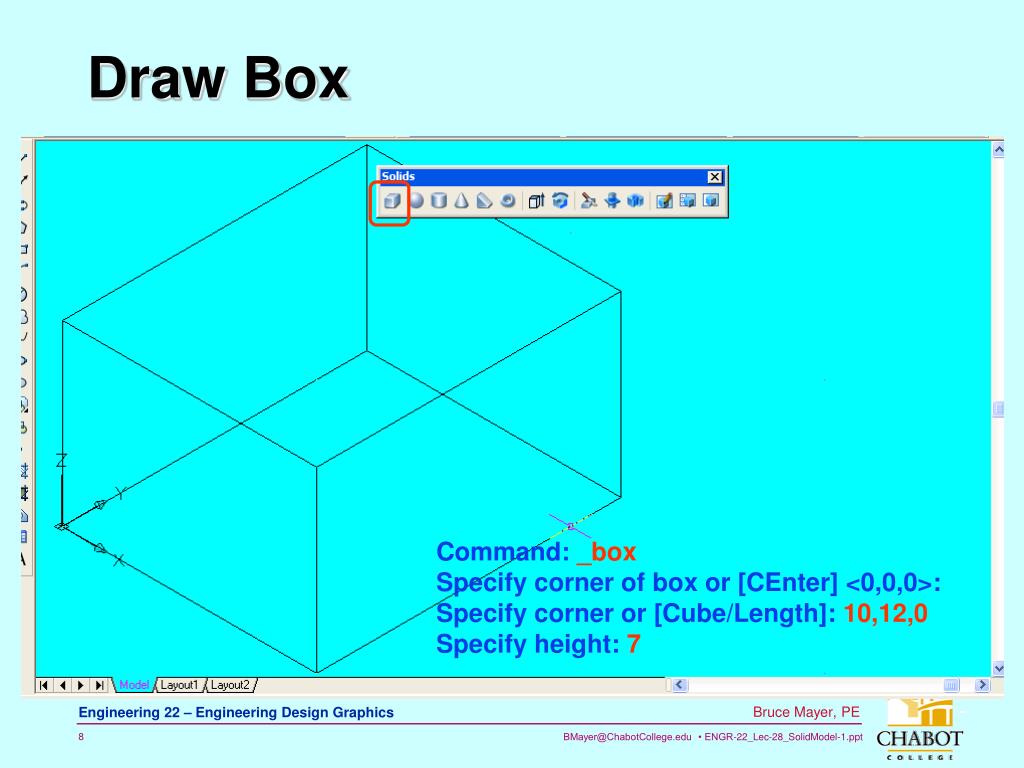 Draw Box Command: _box Specify corner of box or [CEnter] <0,0,0>: Specify corner or [Cube/Length]: 10,12,0 Specify height: 7