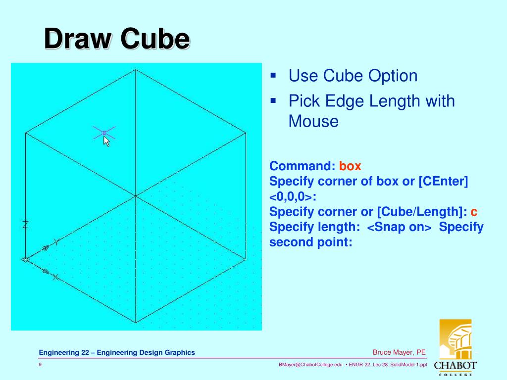 Draw Cube • Use Cube Option • Pick Edge Length with Mouse Command: box Specify corner of box or [CEnter] <0,0,0>: Specify corner or [Cube/Length]: c Specify length: <Snap on> Specify second point: