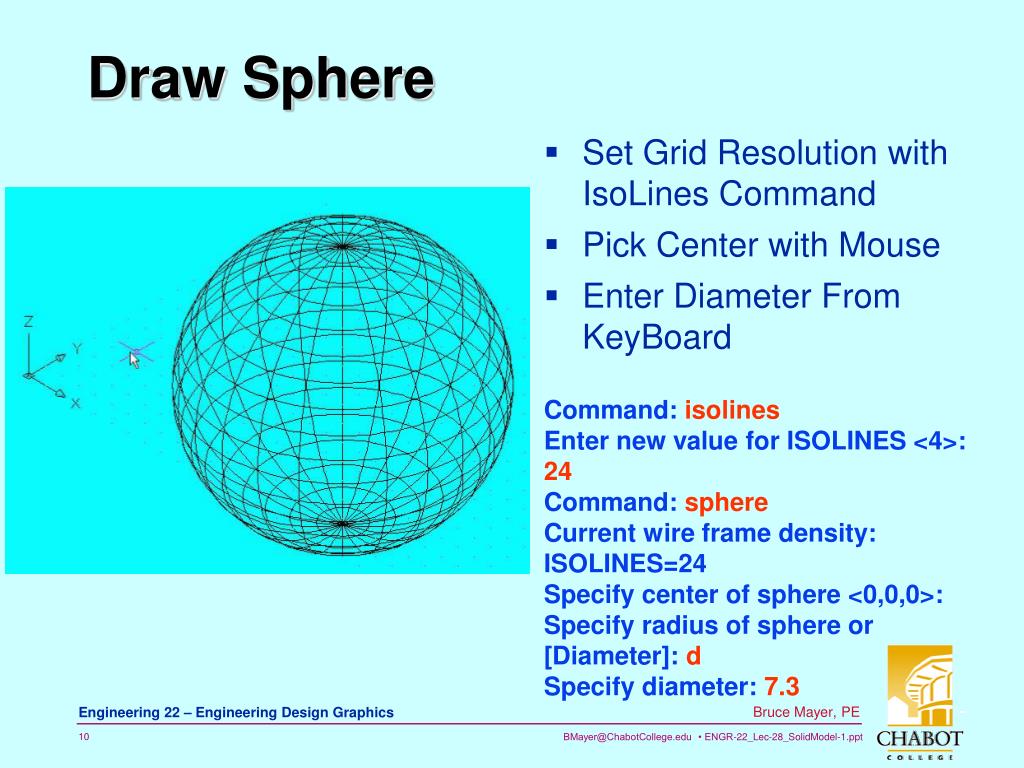 Draw Sphere • Set Grid Resolution with IsoLines Command • Pick Center with Mouse • Enter Diameter From KeyBoard Command: isolines Enter new value for ISOLINES <4>: 24 Command: sphere Current wire frame density: ISOLINES=24 Specify center of sphere <0,0,0>: Specify radius of sphere or [Diameter]: d Specify diameter: 7.3