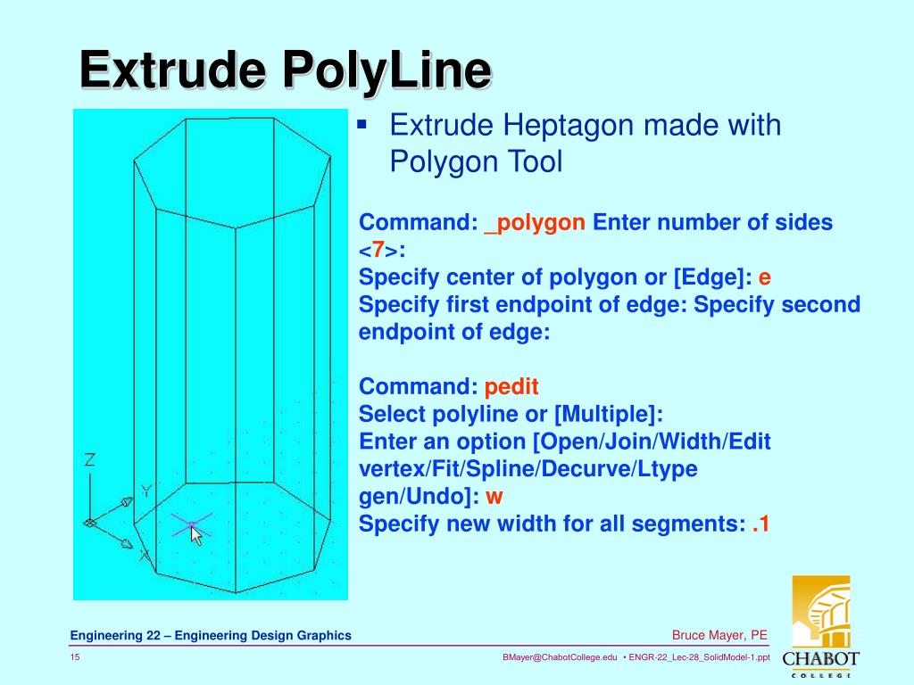 Extrude PolyLine • Extrude Heptagon made with Polygon Tool Command: _polygon Enter number of sides <7>: Specify center of polygon or [Edge]: e Specify first endpoint of edge: Specify second endpoint of edge: Command: pedit Select polyline or [Multiple]: Enter an option [Open/Join/Width/Edit vertex/Fit/Spline/Decurve/Ltype gen/Undo]: w Specify new width for all segments: .1