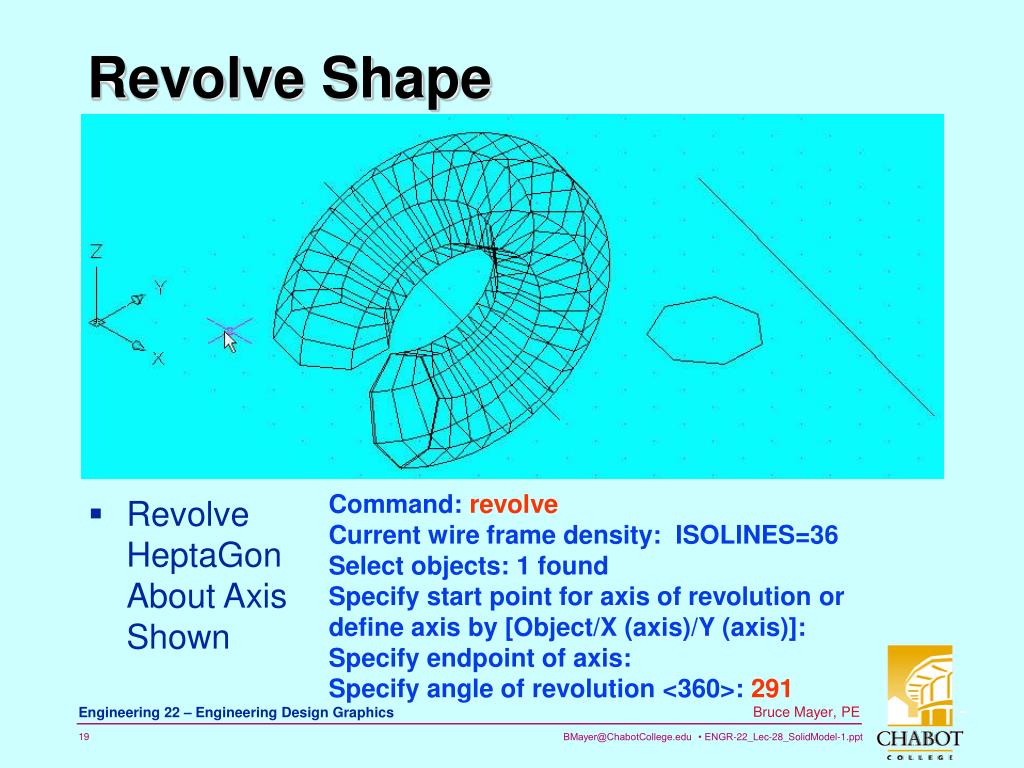 Revolve Shape Command: revolve Current wire frame density: ISOLINES=36 Select objects: 1 found Specify start point for axis of revolution or define axis by [Object/X (axis)/Y (axis)]: Specify endpoint of axis: Specify angle of revolution <360>: 291 • Revolve HeptaGon About Axis Shown