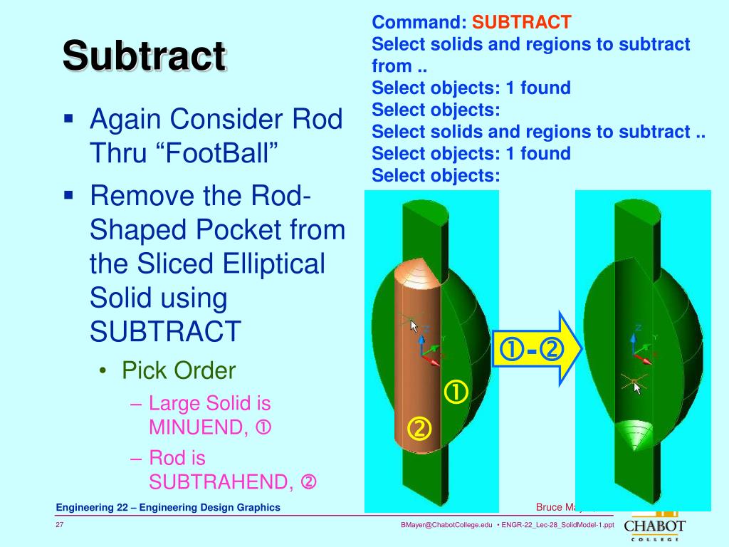 Again Consider Rod Thru “FootBall” Remove the Rod-Shaped Pocket from the Sliced Elliptical Solid using SUBTRACT Pick Order Large Solid is MINUEND, Rod is SUBTRAHEND, Command: SUBTRACT Select solids and regions to subtract from .. Select objects: 1 found Select objects: Select solids and regions to subtract .. Select objects: 1 found Select objects: Subtract -