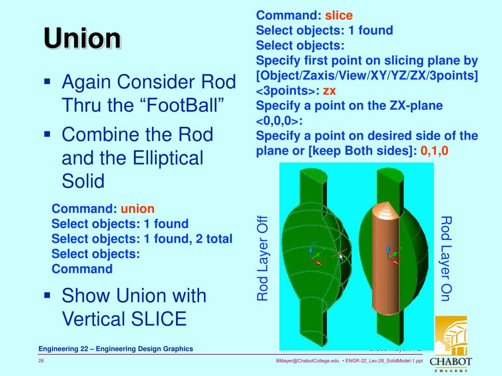 Again Consider Rod Thru the “FootBall” Combine the Rod and the Elliptical Solid Command: slice Select objects: 1 found Select objects: Specify first point on slicing plane by [Object/Zaxis/View/XY/YZ/ZX/3points] <3points>: zx Specify a point on the ZX-plane <0,0,0>: Specify a point on desired side of the plane or [keep Both sides]: 0,1,0 Union Command: union Select objects: 1 found Select objects: 1 found, 2 total Select objects: Command Rod Layer Off Rod Layer On • Show Union with Vertical SLICE