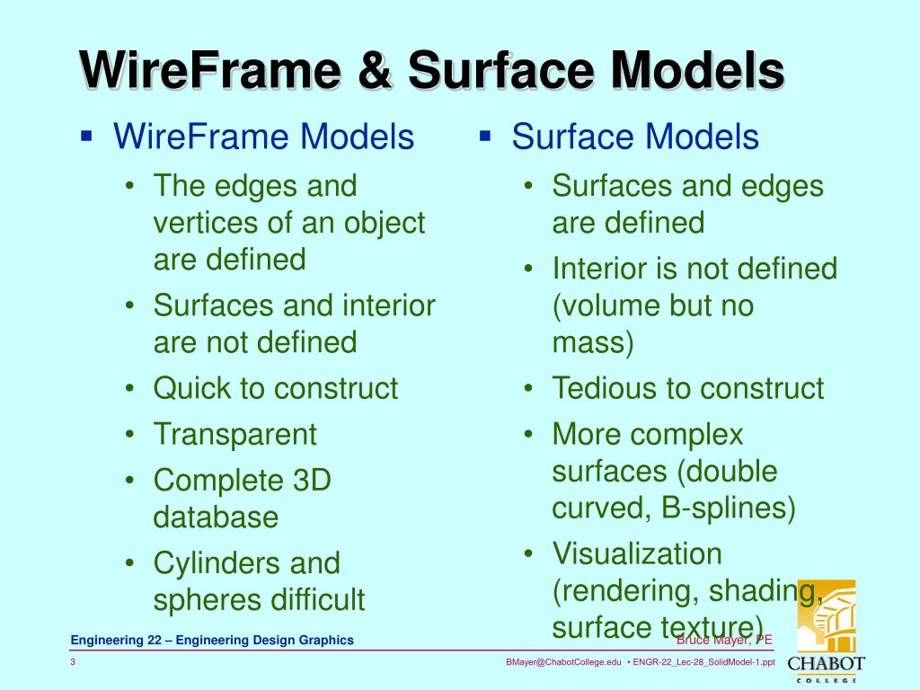 WireFrame Models The edges and vertices of an object are defined Surfaces and interior are not defined Quick to construct Transparent Complete 3D database Cylinders and spheres difficult Surface Models Surfaces and edges are defined Interior is not defined (volume but no mass) Tedious to construct More complex surfaces (double curved, B-splines) Visualization (rendering, shading, surface texture) WireFrame & Surface Models
