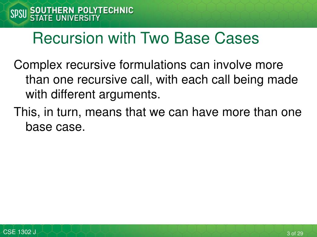 Recursion with Two Base Cases Complex recursive formulations can involve more than one recursive call, with each call being made with different arguments. This, in turn, means that we can have more than one base case.
