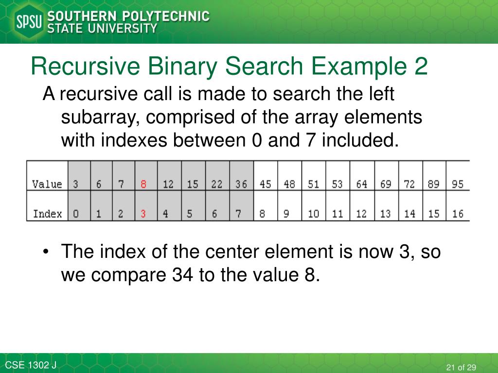 Recursive Binary Search Example 2 A recursive call is made to search the left subarray, comprised of the array elements with indexes between 0 and 7 included. • The index of the center element is now 3, so we compare 34 to the value 8.