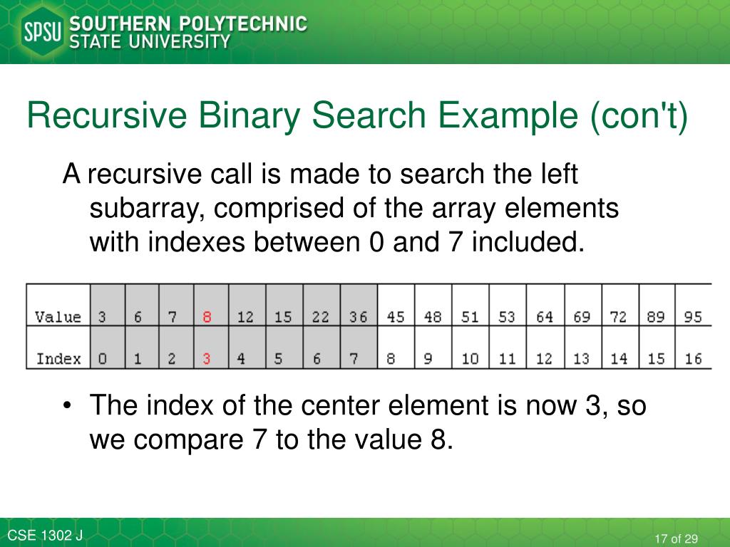 Recursive Binary Search Example (con't) A recursive call is made to search the left subarray, comprised of the array elements with indexes between 0 and 7 included. • The index of the center element is now 3, so we compare 7 to the value 8.