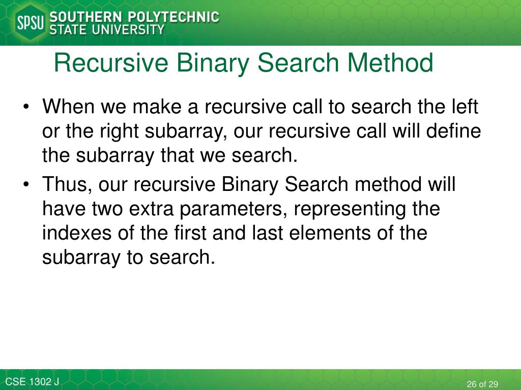 Recursive Binary Search Method • When we make a recursive call to search the left or the right subarray, our recursive call will define the subarray that we search. • Thus, our recursive Binary Search method will have two extra parameters, representing the indexes of the first and last elements of the subarray to search.