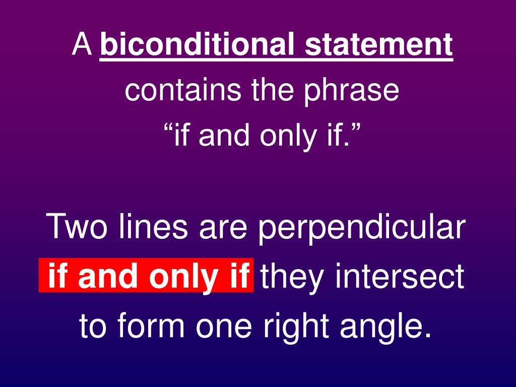 Two lines are perpendicular if and only if they intersect to form one right angle. A biconditional statement contains the phrase “if and only if.”