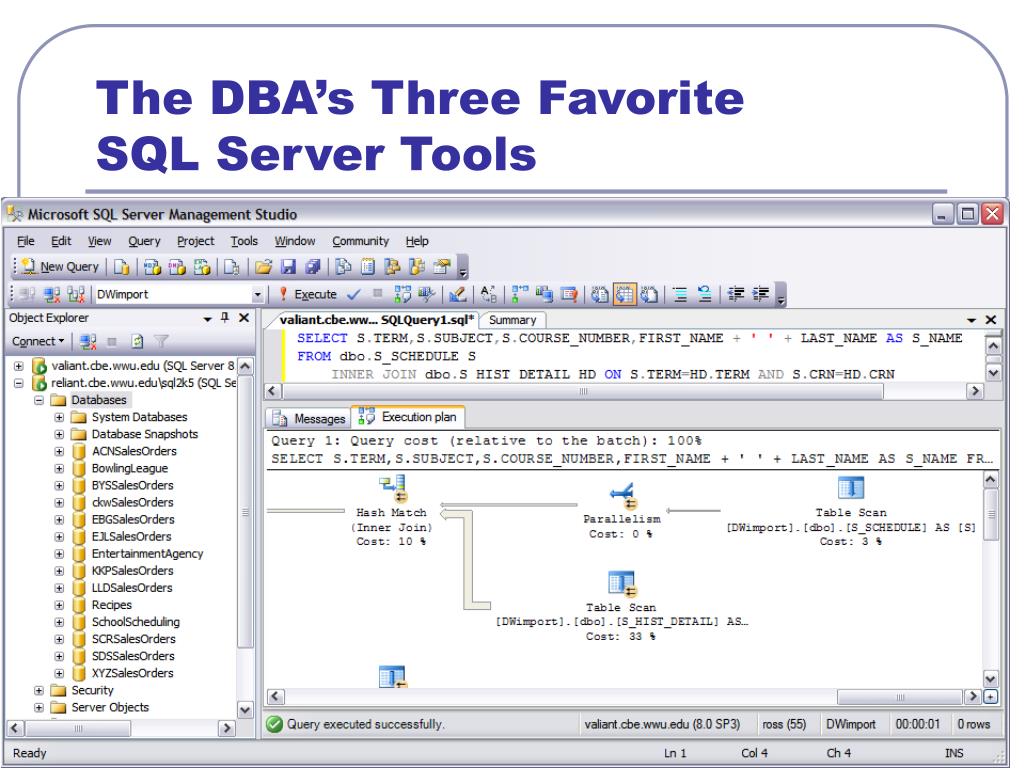 The DBA’s Three Favorite SQL Server Tools • Management Studio Query • Object browser • Command line interface • Create and test statements • Execute statements – DDL, DML, DCL • Execution plan