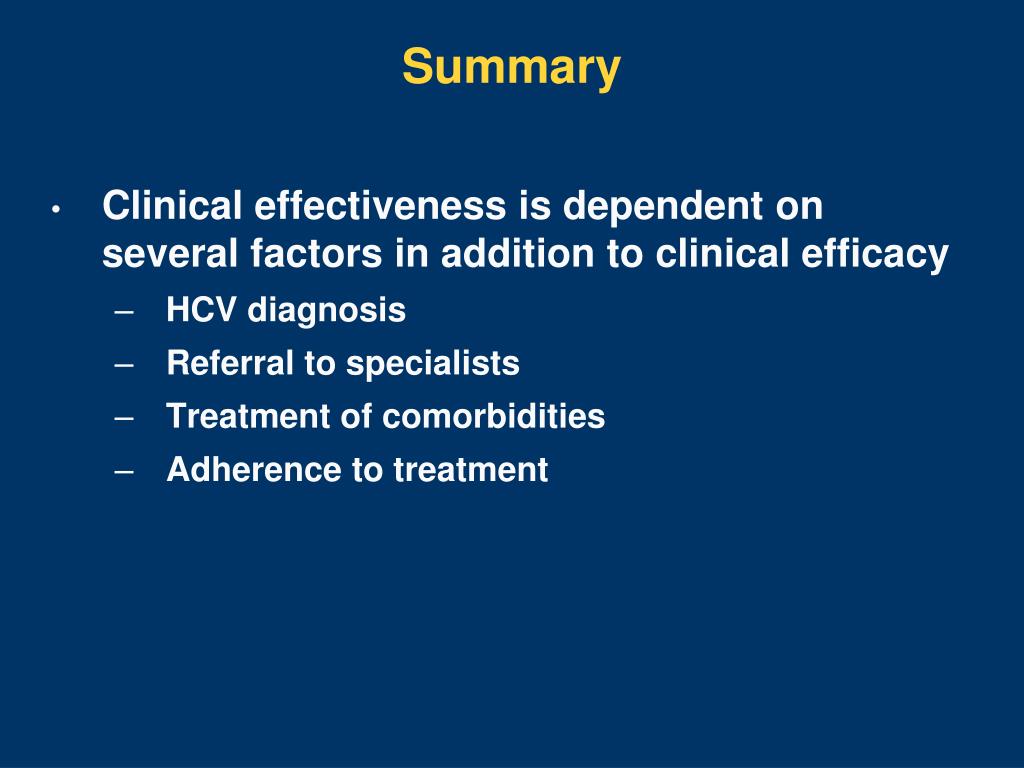 Summary • Clinical effectiveness is dependent on several factors in addition to clinical efficacy • HCV diagnosis • Referral to specialists • Treatment of comorbidities • Adherence to treatment