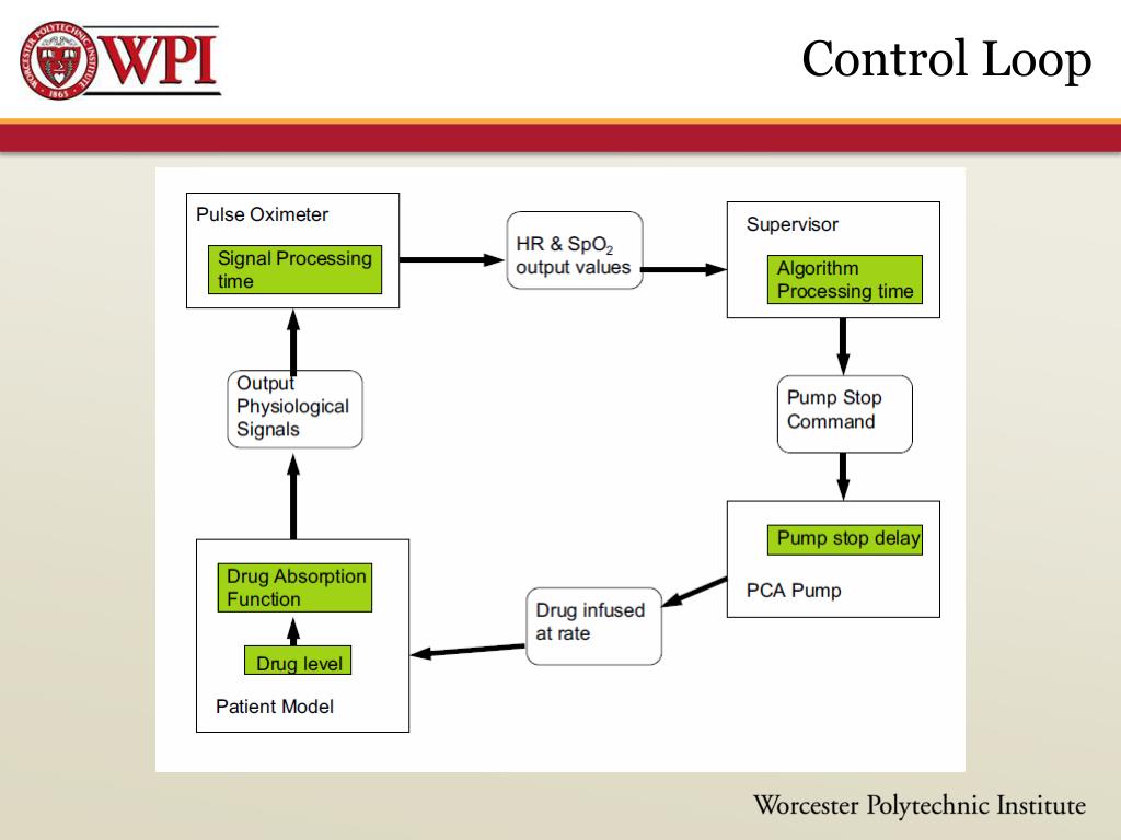 Supervisor Model Decides when to stop pump to keep patient out of critical region Clinical application script (CAS) Alarming Region Sp02 <90% or HR <57 bpm Notify caregiver – Alarming condition