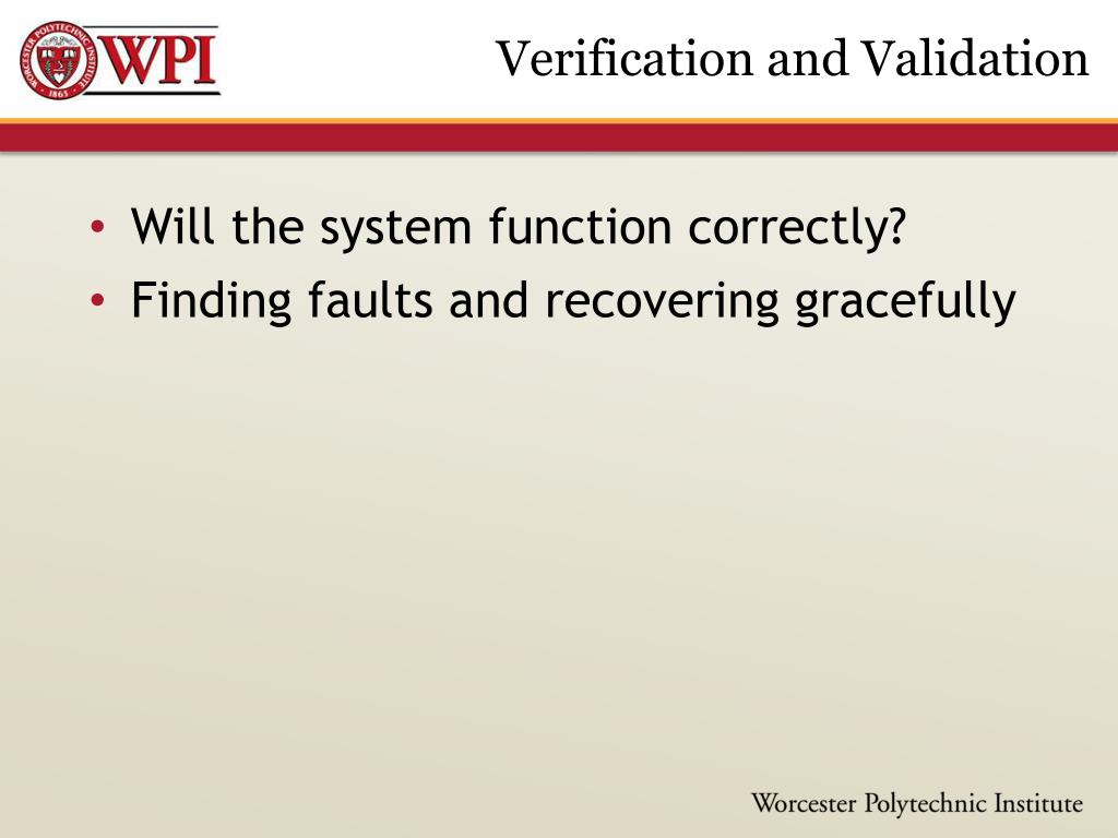 Verification and Validation Will the system function correctly? Finding faults and recovering gracefully