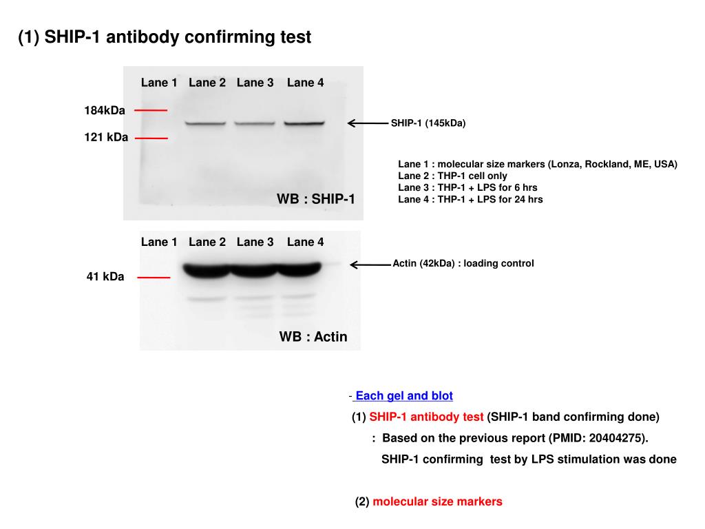 (1) SHIP-1 antibody confirming test Lane 1 Lane 2 Lane 3 Lane 4 184kDa SHIP-1 (145kDa) 121 kDa Lane 1 : molecular size markers (Lonza, Rockland, ME, USA) Lane 2 : THP-1 cell only Lane 3 : THP-1 + LPS for 6 hrs Lane 4 : THP-1 + LPS for 24 hrs WB : SHIP-1 Lane 1 Lane 2 Lane 3 Lane 4 Actin (42kDa) : loading control 41 kDa WB : Actin • Each gel and blot • (1) SHIP-1 antibody test (SHIP-1 band confirming done) • : Based on the previous report (PMID: 20404275). • SHIP-1 confirming test by LPS stimulation was done • (2) molecular size markers