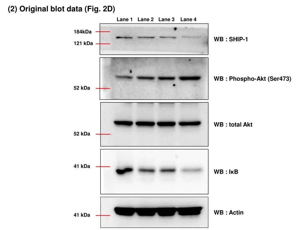 (2) Original blot data (Fig. 2D) Lane 1 Lane 2 Lane 3 Lane 4 184kDa WB : SHIP-1 121 kDa WB : Phospho-Akt (Ser473) 52 kDa WB : total Akt 52 kDa 41 kDa WB : IκB WB : Actin 41 kDa