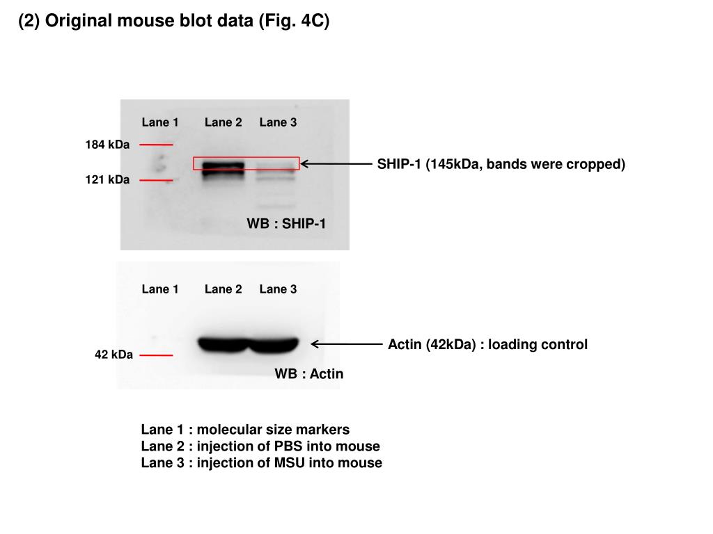 (2) Original mouse blot data (Fig. 4C) Lane 1 Lane 2 Lane 3 184 kDa SHIP-1 (145kDa, bands were cropped) 121 kDa WB : SHIP-1 Lane 1 Lane 2 Lane 3 Actin (42kDa) : loading control 42 kDa WB : Actin Lane 1 : molecular size markers Lane 2 : injection of PBS into mouse Lane 3 : injection of MSU into mouse