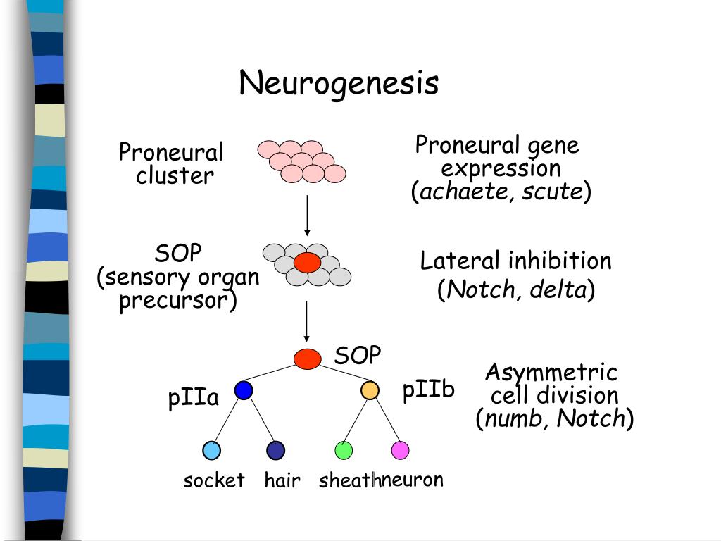 Neurogenesis Proneural gene expression (achaete, scute) Proneural cluster SOP (sensory organ precursor) Lateral inhibition (Notch, delta) SOP Asymmetric cell division (numb, Notch) pIIb pIIa neuron socket hair sheath