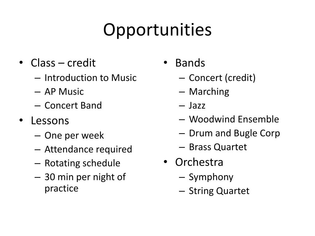 Opportunities • Class – credit • Introduction to Music • AP Music • Concert Band • Lessons • One per week • Attendance required • Rotating schedule • 30 min per night of practice • Bands • Concert (credit) • Marching • Jazz • Woodwind Ensemble • Drum and Bugle Corp • Brass Quartet • Orchestra • Symphony • String Quartet