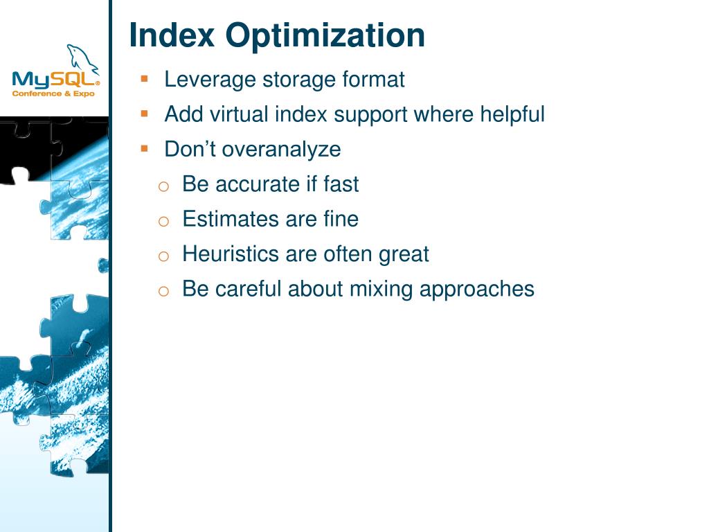 Index Optimization • Leverage storage format • Add virtual index support where helpful • Don’t overanalyze • Be accurate if fast • Estimates are fine • Heuristics are often great • Be careful about mixing approaches