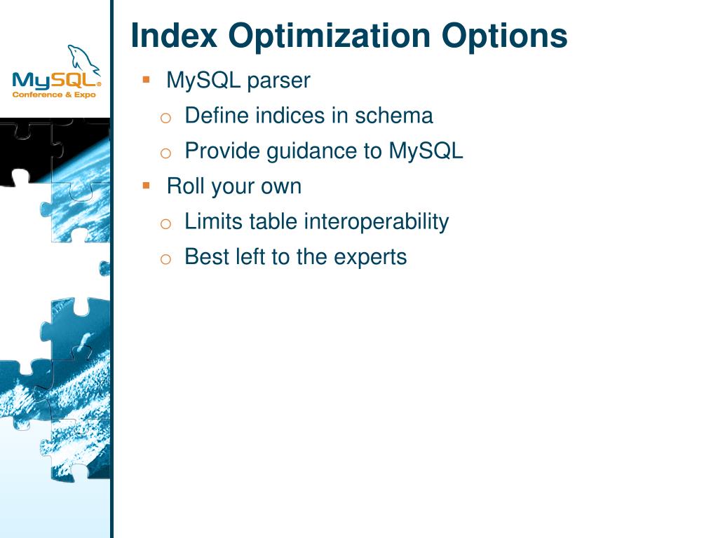 Index Optimization Options • MySQL parser • Define indices in schema • Provide guidance to MySQL • Roll your own • Limits table interoperability • Best left to the experts
