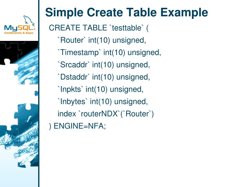 Simple Create Table Example CREATE TABLE `testtable` ( `Router` int(10) unsigned, `Timestamp` int(10) unsigned, `Srcaddr` int(10) unsigned, `Dstaddr` int(10) unsigned, `Inpkts` int(10) unsigned, `Inbytes` int(10) unsigned, index `routerNDX`(`Router`) ) ENGINE=NFA;