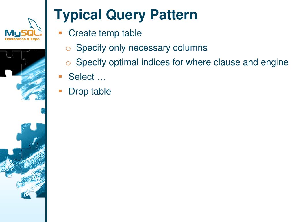 Typical Query Pattern • Create temp table • Specify only necessary columns • Specify optimal indices for where clause and engine • Select … • Drop table