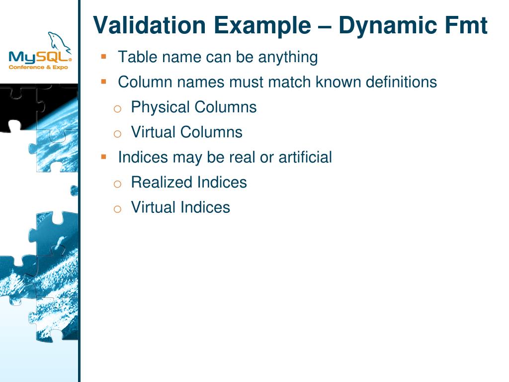 Validation Example – Dynamic Fmt • Table name can be anything • Column names must match known definitions • Physical Columns • Virtual Columns • Indices may be real or artificial • Realized Indices • Virtual Indices