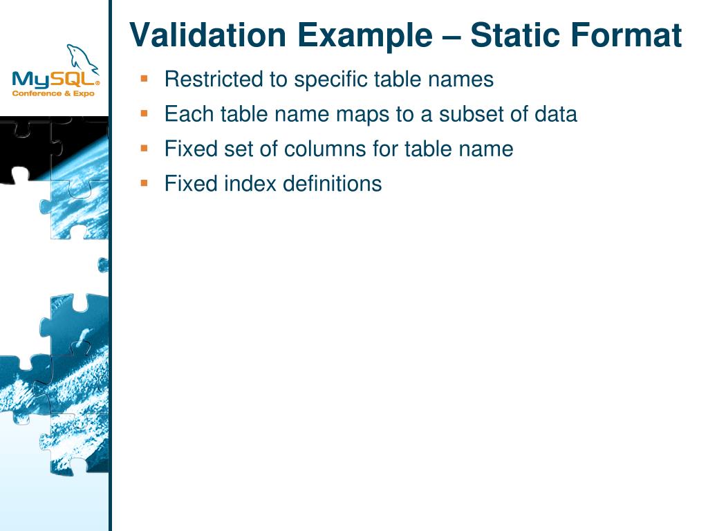 Validation Example – Static Format • Restricted to specific table names • Each table name maps to a subset of data • Fixed set of columns for table name • Fixed index definitions