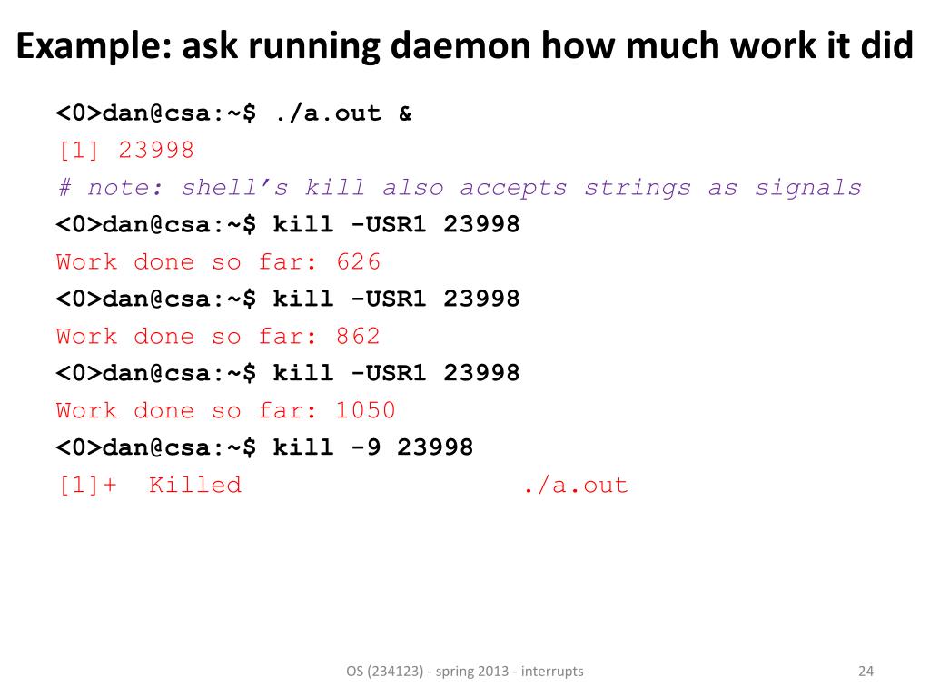 Example: ask running daemon how much work it did <0>dan@csa:~$ ./a.out& [1] 23998 # note: shell’s kill also accepts strings as signals <0>dan@csa:~$ kill -USR1 23998 Work done so far: 626 <0>dan@csa:~$ kill -USR1 23998 Work done so far: 862 <0>dan@csa:~$ kill -USR1 23998 Work done so far: 1050 <0>dan@csa:~$ kill -9 23998 [1]+ Killed ./a.out OS (234123) - spring 2013 - interrupts
