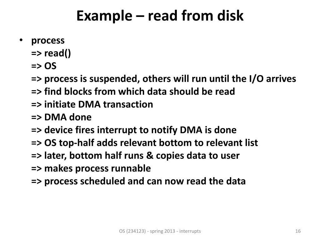 Example – read from disk • process=> read()=> OS=> process is suspended, others will run until the I/O arrives=> find blocks from which data should be read=> initiate DMA transaction=> DMA done=> device fires interrupt to notify DMA is done=> OS top-half adds relevant bottom to relevant list=> later, bottom half runs & copies data to user=> makes process runnable=> process scheduled and can now read the data OS (234123) - spring 2013 - interrupts