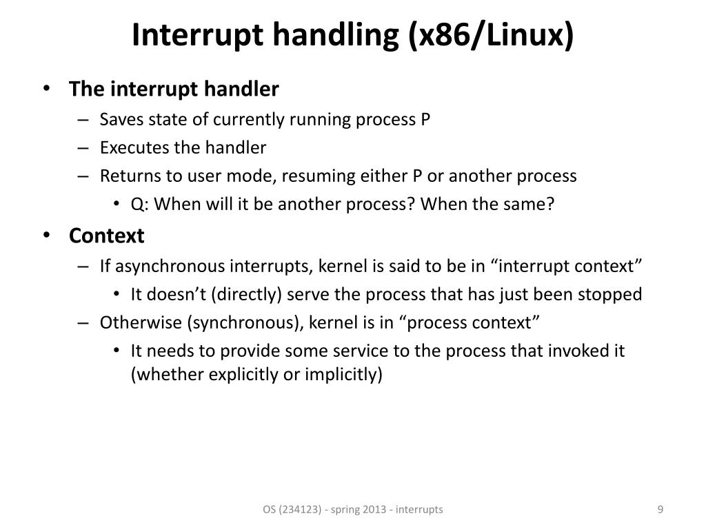 Interrupt handling (x86/Linux) • The interrupt handler • Saves state of currently running process P • Executes the handler • Returns to user mode, resuming either P or another process • Q: When will it be another process? When the same? • Context • If asynchronous interrupts, kernel is said to be in “interrupt context” • It doesn’t (directly) serve the process that has just been stopped • Otherwise (synchronous), kernel is in “process context” • It needs to provide some service to the process that invoked it (whether explicitly or implicitly) OS (234123) - spring 2013 - interrupts