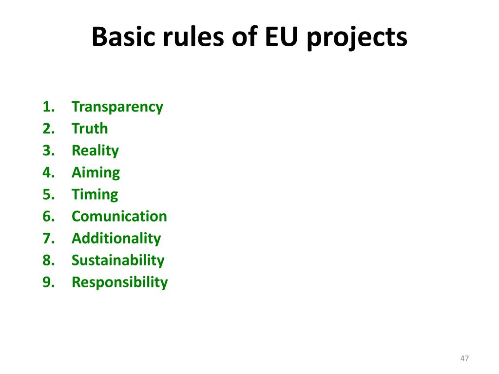 Basic rules of EU projects Transparency Truth Reality Aiming Timing Comunication Additionality Sustainability Responsibility
