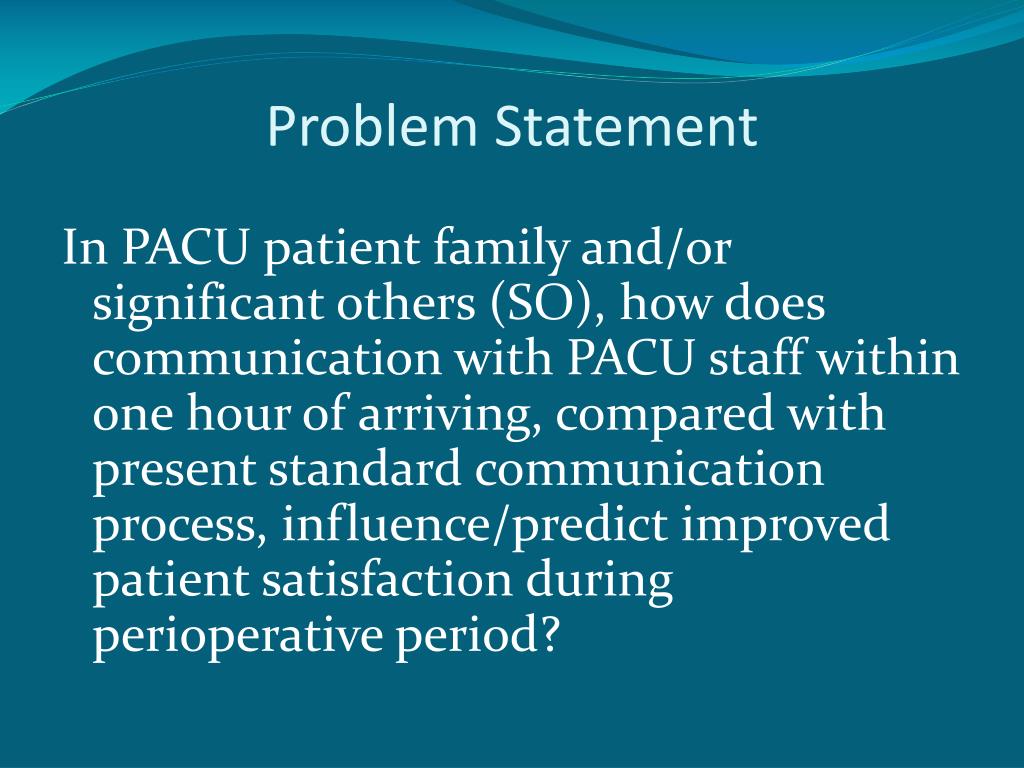 Problem Statement In PACU patient family and/or significant others (SO), how does communication with PACU staff within one hour of arriving, compared with present standard communication process, influence/predict improved patient satisfaction during perioperative period?