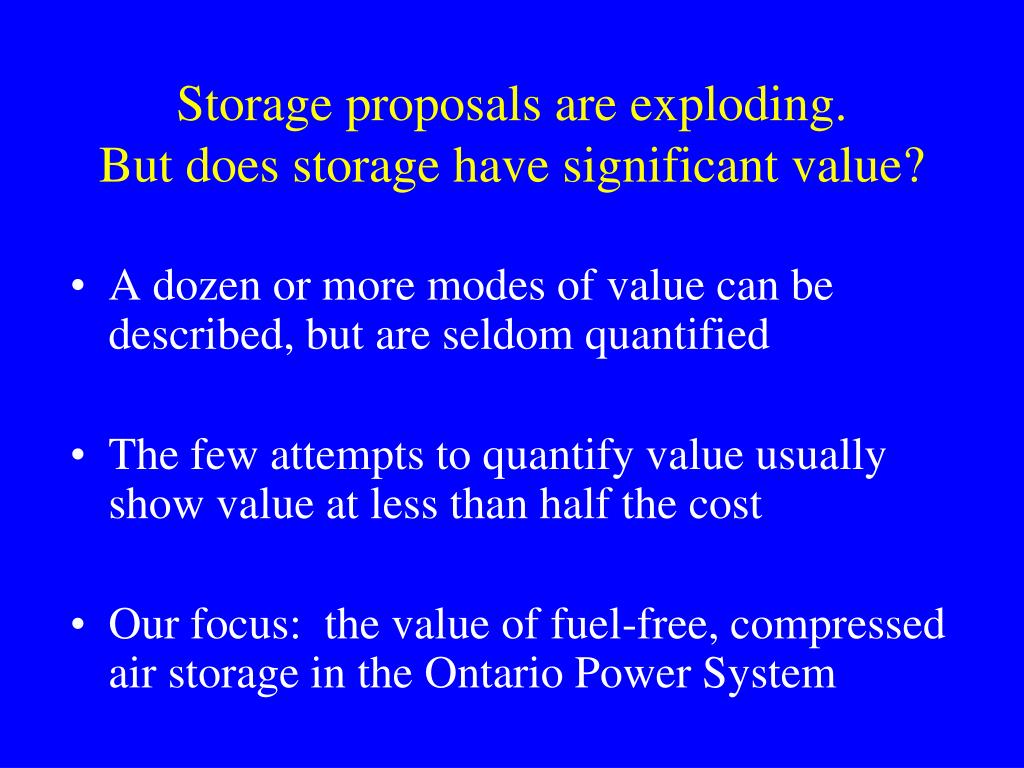Storage proposals are exploding.But does storage have significant value? • A dozen or more modes of value can be described, but are seldom quantified • The few attempts to quantify value usually show value at less than half the cost • Our focus: the value of fuel-free, compressed air storage in the Ontario Power System