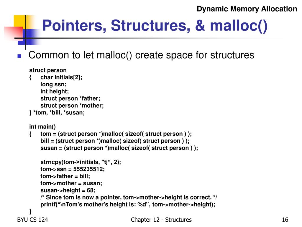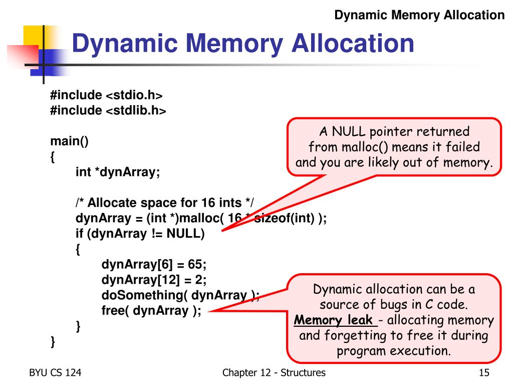 Dynamic Memory Allocation Dynamic Memory Allocation #include <stdio.h> #include <stdlib.h> main() { int *dynArray; /* Allocate space for 16 ints */ dynArray = (int *)malloc( 16 * sizeof(int) ); if (dynArray != NULL) { dynArray[6] = 65; dynArray[12] = 2; doSomething( dynArray ); free( dynArray); } } A NULL pointer returned from malloc() means it failed and you are likely out of memory. Dynamic allocation can be a source of bugs in C code. Memory leak - allocating memory and forgetting to free it during program execution. Chapter 12 - Structures